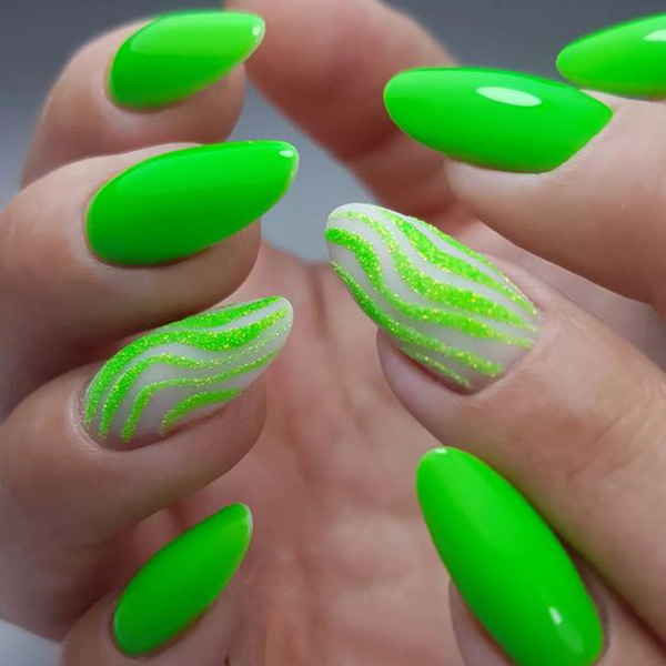 سبز جیغ یا نئون، انتخابی جسورانه است که در سالهای اخیر بسیار پرطرفدار شده. این رنگ برای طراحی ناخنهای تابستانی مهمانیها بسیار جذاب است.