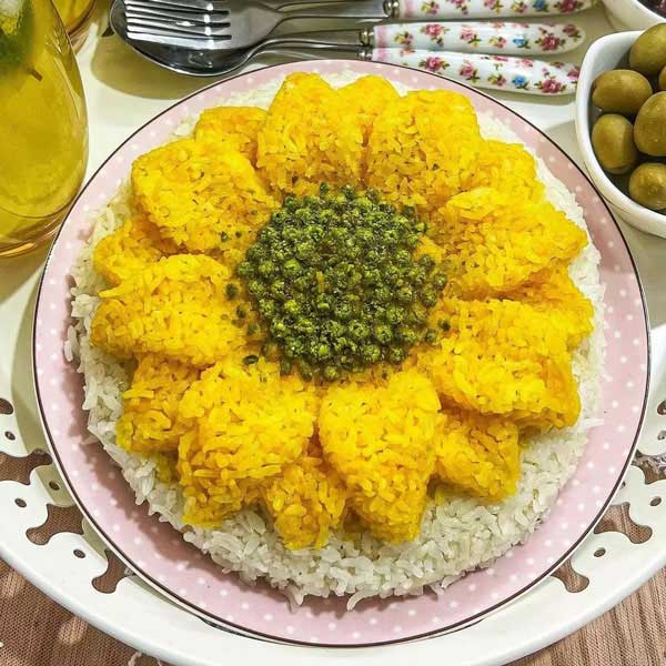 زعفران یکی از پرکاربردترین مواد برای تزیین برنج است. برای این کار، مقدار کمی زعفران را در آب جوش حل کنید و با برنج ترکیب کنید. سپس آن را به شکلهای مختلف مانند گل، قلب یا خطوط مورب روی برنج سفید قرار دهید. میتوانید از شابلونهای مخصوص استفاده کنید تا نقشهای متنوعی روی برنج ایجاد شود. همچنین ترکیب برنج زعفرانی با زرشک میتواند جلوهای لوکس به غذای شما ببخشد.
