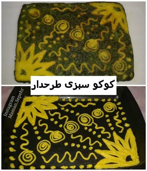 اگر شل و روان بود کمی آرد نخود چی اضافه کنید. کف تابه رژیمی را با برس چرب کنید (اگر روغن زیاد بریزید طرح شناور میشود ) ومواد کوکو را داخل قیف یکبار مصرف بریزید و طرحت را بکشید بعد پنج دقیقه روی حرارت متوسط بگزارید تا خودش را بگیرد و طرحتان فیکس شود .حال که طرح خودش را گرفت میتوانید دوباره روغن به اندازه کافی بریزید بعد مایع کوکو سبزی را کم کم با قاشق رویش بریزید و درش را ببندید تا باحرارت ملایم یک طرفش سرخ شود. تابه را بچرخانید تا طرف دیگه اش هم سرخ شود.