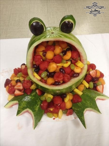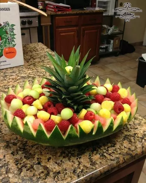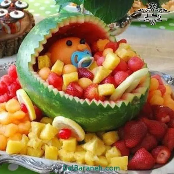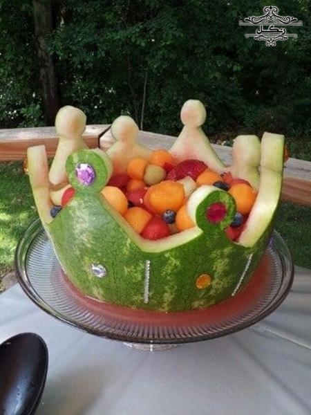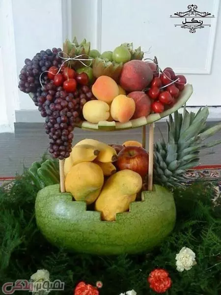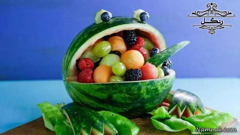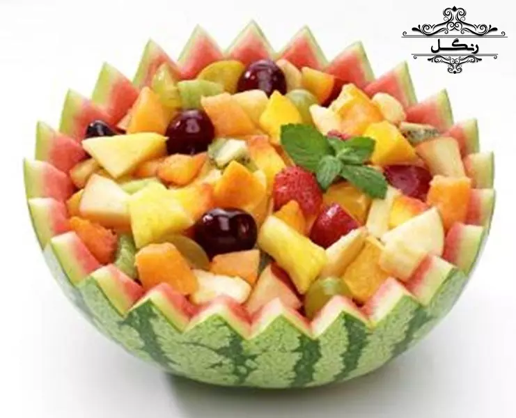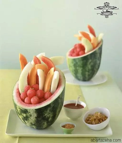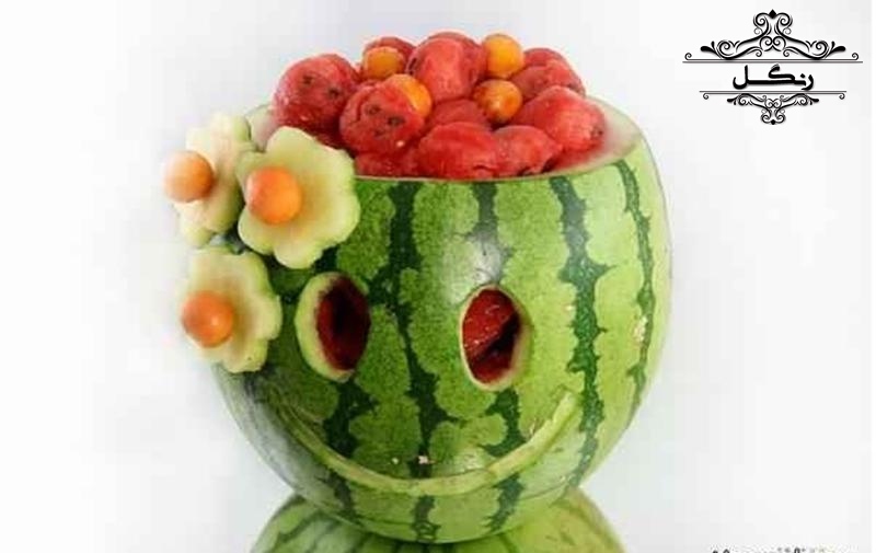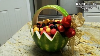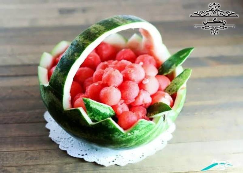 - برش هندوانه به شکل یک سبد و پر کردن آن با تکه‌های میوه‌های دیگر