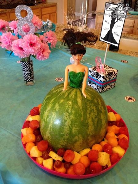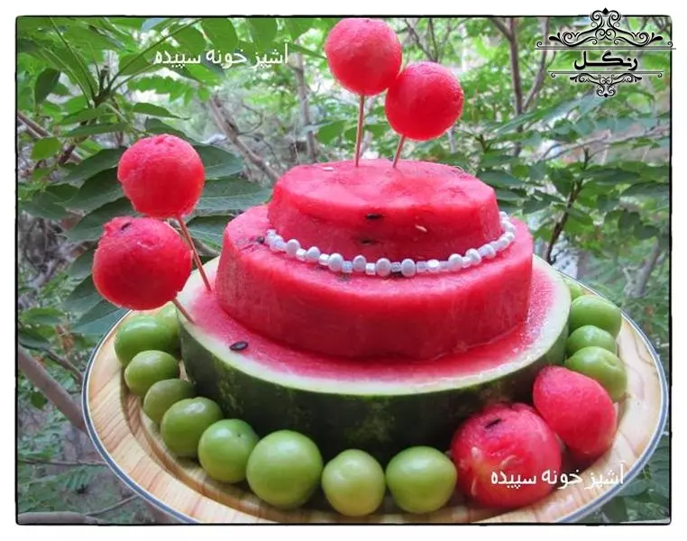 - درست کردن کیک هندوانه با قرار دادن تکه‌های ضخیم هندوانه روی هم و تزیین با میوه‌ها