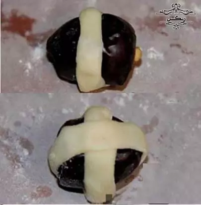 ۵- خمیر را یک دور , دور هر خرما میپیچیم و اضافی آن را جدا میکنیم.