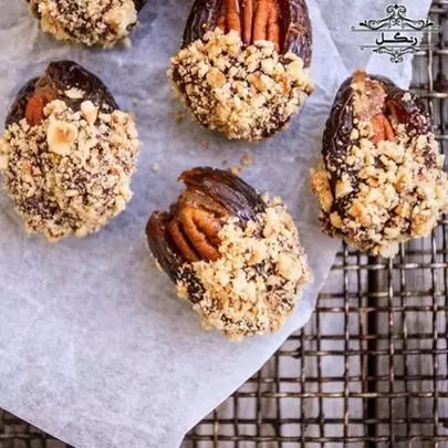 ۳- هسته ی خرماها را با چنگال یا خلال دندان بیرون می آوریم و داخل هر دانه خرما ۱/۴ گردو می گذاریم .