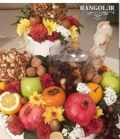 انار، با دانه‌های قرمز خود، نمادی از عشق و برکت است. همراه آن، میوه‌های دیگری نیز تزئین می‌شوند تا سبدی رنگارنگ و جذاب تشکیل دهند.