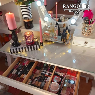 برای چیدمان میز آرایش عروس میتوانید از باکس ها و سبدهای نظم دهنده استفاده کنید. به دلیل اینکه تمامی وسایل و لوازم آرایش بهداشتی کوچک هستند و نظم و ترتیب خاصی ندارند ، برای نظم دادن به کشوهای میز آرایش عروس از سبدها یا باکس ها یا تقسیم کننده های نظم دهنده استفاده کنید و هرچیزی را با یک دسته بندی خاصی بگزارید. برای روی میز آرایش نیز میتوانید از یک باکس یا سینی دکوری خوشگل استفاده کنید چند وسیله جلوی دستی را روی آن بگزارید. برای اینکه چوب میز شما خراب نشود و در اثر مرور زمان دچار تغییر رنگ و یا خراشیدگی نشود میتوانید از شیشه و یا آینه یا طلق رومیزی برای روی آن استفاده کنید.