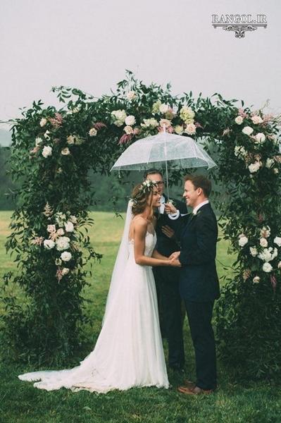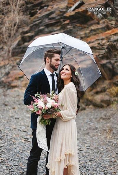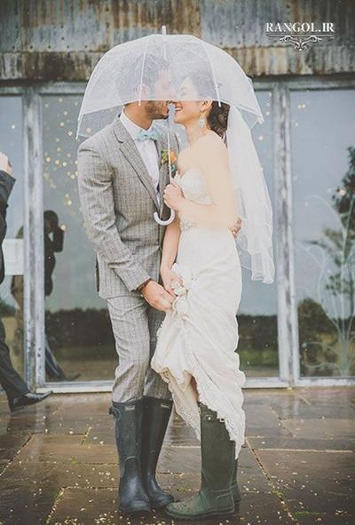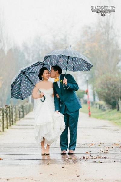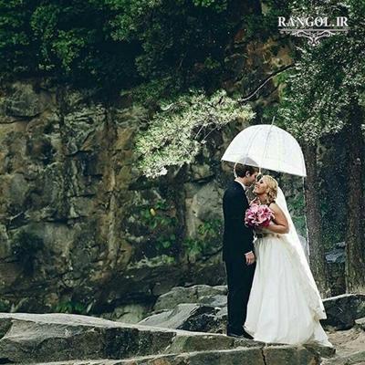 اگه روز عروسیتان بارون بیاید,خوشحال میشوید یا ناراحت؟ قطعا خیلی از شما ناراحت میشوید و خیلی از شما نیز خوشحال میشوید. بارش باران در عکس ها ممکن است عکس ها را رمانتیک و خاص کند اما باید مراقب باشد که میکاپ و موهایتان خیس نشود و بهم نخورد. و یا اگر اهل ریسک باشید اگر میکاپتان هم بریزد ناراحت نخواهید شد. اگر عروسی یا فرمالیته شما در فصل بهار یا پاییز یا زمستان باشد ، باید این احتمال را بدهید که باران یا برف ببارد. بنابراین پیشنهاد رنگل به شما این است که با خودتان چتر داشته باشید. حتما چند روز قبل از روز عکاسی, وضعیت هوا را چک کنید. اگر ابری هم بود حتما چترتان را ببرید. عکس هایی که با چتر گرفته میشود خیلی خوشگل و متفاوت هستند, مخصوصا اگه آن چتر را تزیین کنید.
