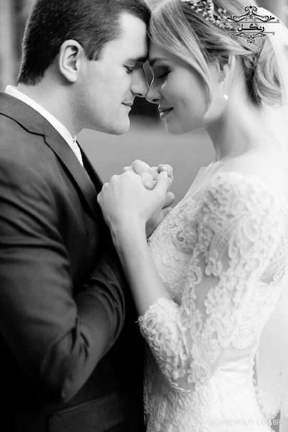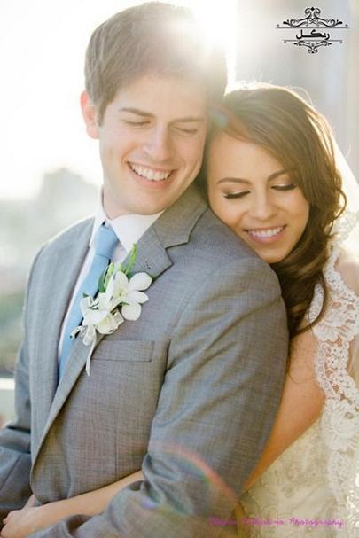 ژست عاشقانه: عروس و داماد به آرامی یکدیگر را در آغوش میکشند و به چشمهای همدیگر نگاه میکنند.