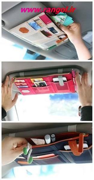 برای موبایل و عینک خود میتوانید کیفی مثل کیف زیر تهیه کنید و آنها را در آن جای دهید. که هم کمتر در معرض آفتاب قرار میگیرند و هم مرتب هستندایده نظم دهنده ماشین - ایده مرتب کردن خودرو- کیف و ساک برای ماشین
