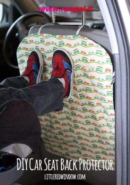 ایده دیگری برای بچه دار ها. اگر کودک شما دائما پاهایش را به صندلی جلو میزند و صندلی و روکش صندلی را کثیف می کند میتوانید از یک پارچه استفاده کنید و به پشت صندلی بیاندازید و مرتب آن را بشویید. میتوانید آن را با نخ به دور صندلی بپیچید.