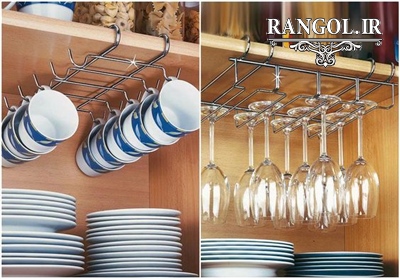 - - برای چیدمان ظروف دارای دسته ی نگهدارنده، مانند قابلمه، می توان از گیره های آویز بر روی ریل های زیر کابینت استفاده کرد؛ یا ریل های نگهدارنده آویز ظروف را به طور جداگانه بر روی دیوار آشپزخانه نصب کنید.