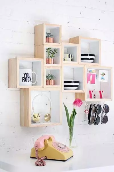 میتوانید از شلف ها و جعبه ها برای جلوه دادن به دیوار اتاقتان استفاده کنید