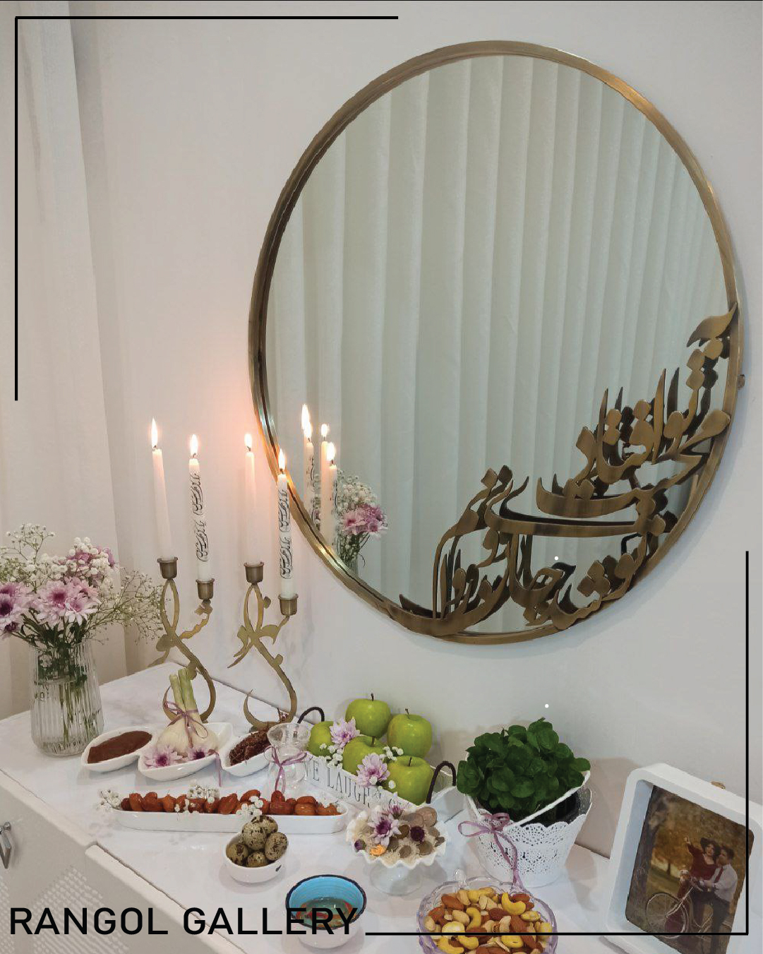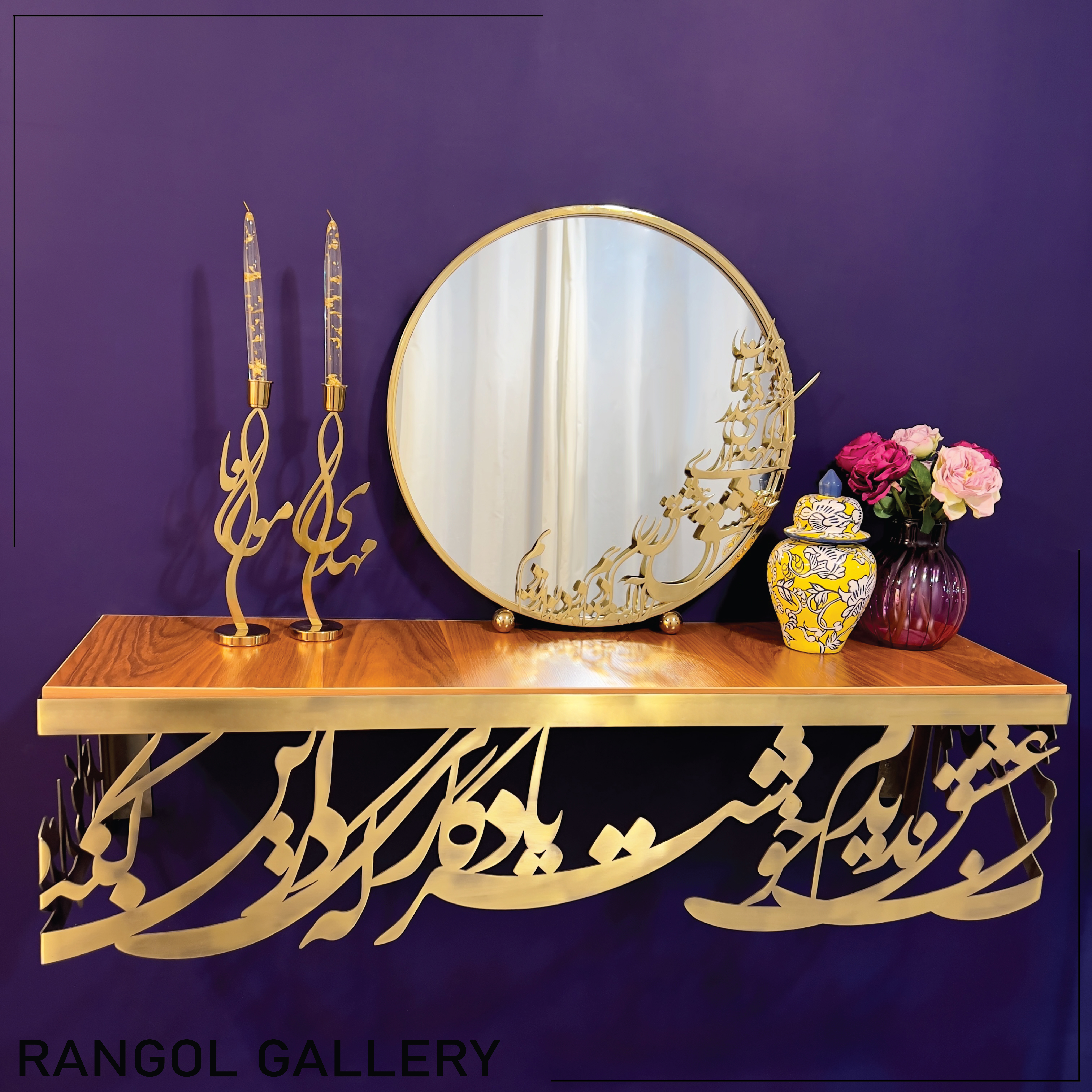 در رنگل گالری ما برای شما آینه دیواری های کالیگرافی میسازیم. به این صورت که شعر مورد علاقه شما را طراحی کرده و بعد از انتخاب توسط شما بصورت آینه درمیارویم. که میتونید در سایزها و رنگ های مختلف سفارش دهید. که میتوانید همراه با شمعدان ها و کنسول دیواری زیر آن سفارش دهید. نمونه هایی از آینه دیواری رنگل گالری را میتوانید در زیر ببینید