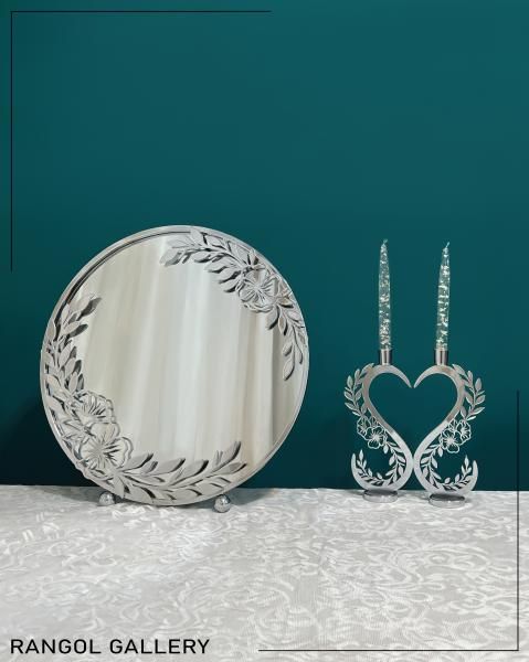 آینه این ست به شکل دایره‌ای طراحی شده و برخلاف مدل‌های کالیگرافی رنگل، روی آن نام، شعر یا متن حکاکی نشده است. در عوض، دو بخش از آینه با نقش برجسته‌ی گل و برگ تزئین شده‌اند که با ظرافت خاصی از دو طرف آینه را در بر گرفته‌اند. همین طراحی متقارن و چشم‌نواز باعث می‌شود آینه جلوه‌ای آرام‌بخش، مینیمال و در عین حال لوکس داشته باشد. استفاده از گل و برگ در طراحی، نمادی از طبیعت، رویش و عشق جاودانه است؛ مفهومی که در مراسم عقد و ازدواج، معنای عمیق‌تری پیدا می‌کند. سطح آینه براق و صیقلی است و با انعکاس نور، در هر فضایی حس درخشندگی و پاکی ایجاد می‌کند.این مدل برای کسانی که به دنبال آینه شمعدان‌های خاص بدون نوشته هستند، انتخابی بی‌نقص است. چون در عین سادگی، طراحی‌اش بسیار چشمگیر و منحصر‌به‌فرد است.