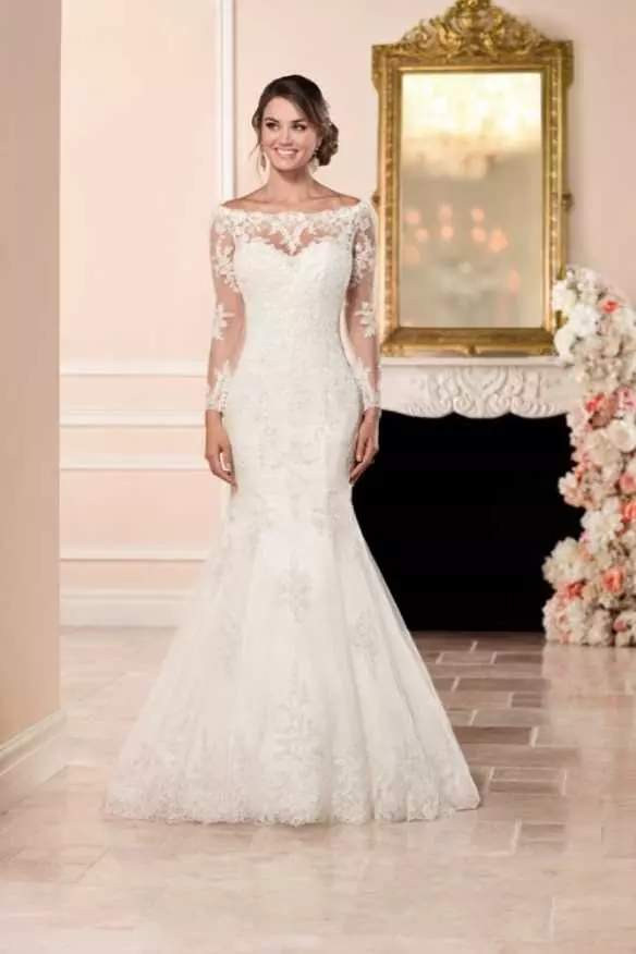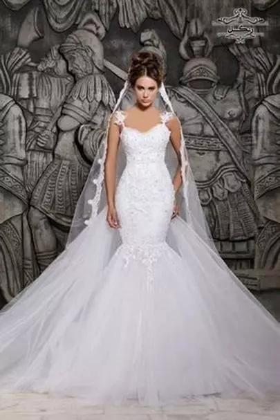 -لباس عروس مدل ماهی یا پری دریایی: این طرح بسیار پر طرفدار کاملا جذب بدن است. قسمت دامن و نیم تنه بالای آن به هم چسبیده و سرهم است. این لباس از بالاتنه تا قسمت شکم و باسن تنگ است و دامن آن از ران یا زانو به پایین گشاد تر و آزاد تر است. معمولا سر تا سر آن گلدوزی شده که
