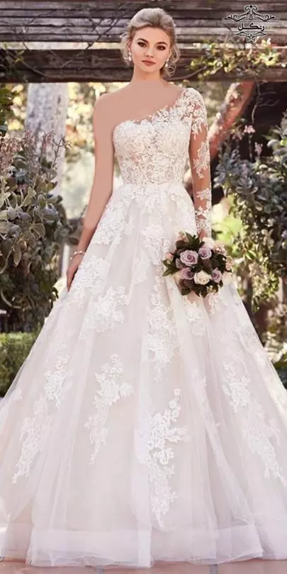 مدل لباس عروس یقه رومی شانه یکطرفه جدید شیک