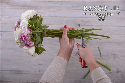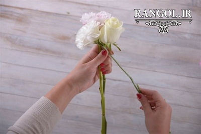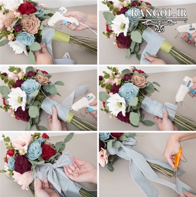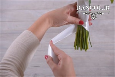 ابتدا گل های مصنوعی یا طبیعی را در رنگ های دلخواه خود خریداری کنید. سپس تیغ ها و برگ های پژمرده و اضافه را جدا کنید. سپس همه شاخه ها به یک اندازه برش بزنید. گل ها را کنار هم بچینید. و در انتها ربان را مثل عکس به دور دسته گل ها بپیچید.