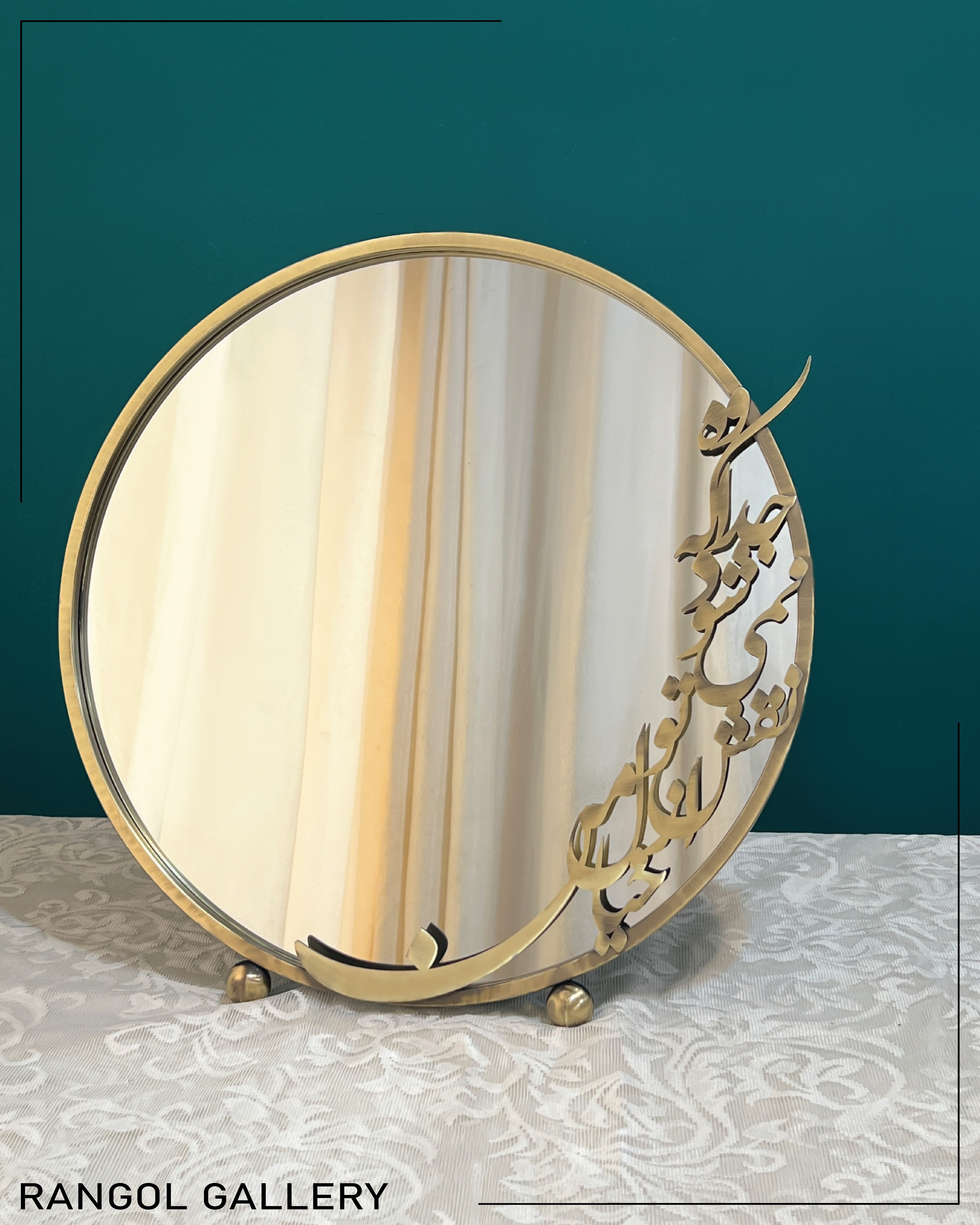 در عکس قطر آینه 40 سانتی متر است و رنگ آنتیک استفاده شده است.اسم شمعدان ها نیلوفر و شروین است. شعر آینه :  وه که جدا نمیشود نقش تو از خیال من  . بعد از ثبت سفارش اسم شمعدان ها و طرح آن و شعر آینه قابل تغییر است.