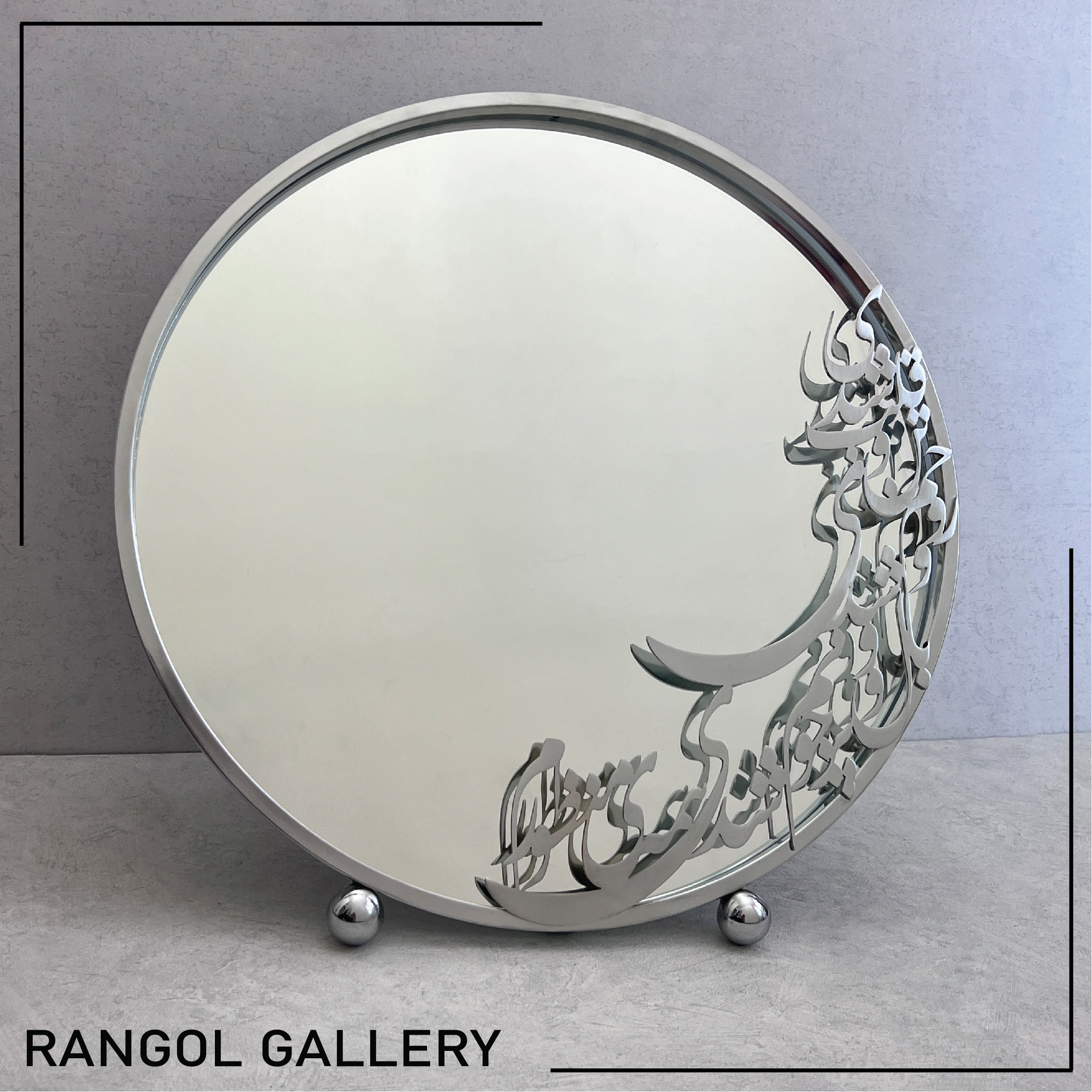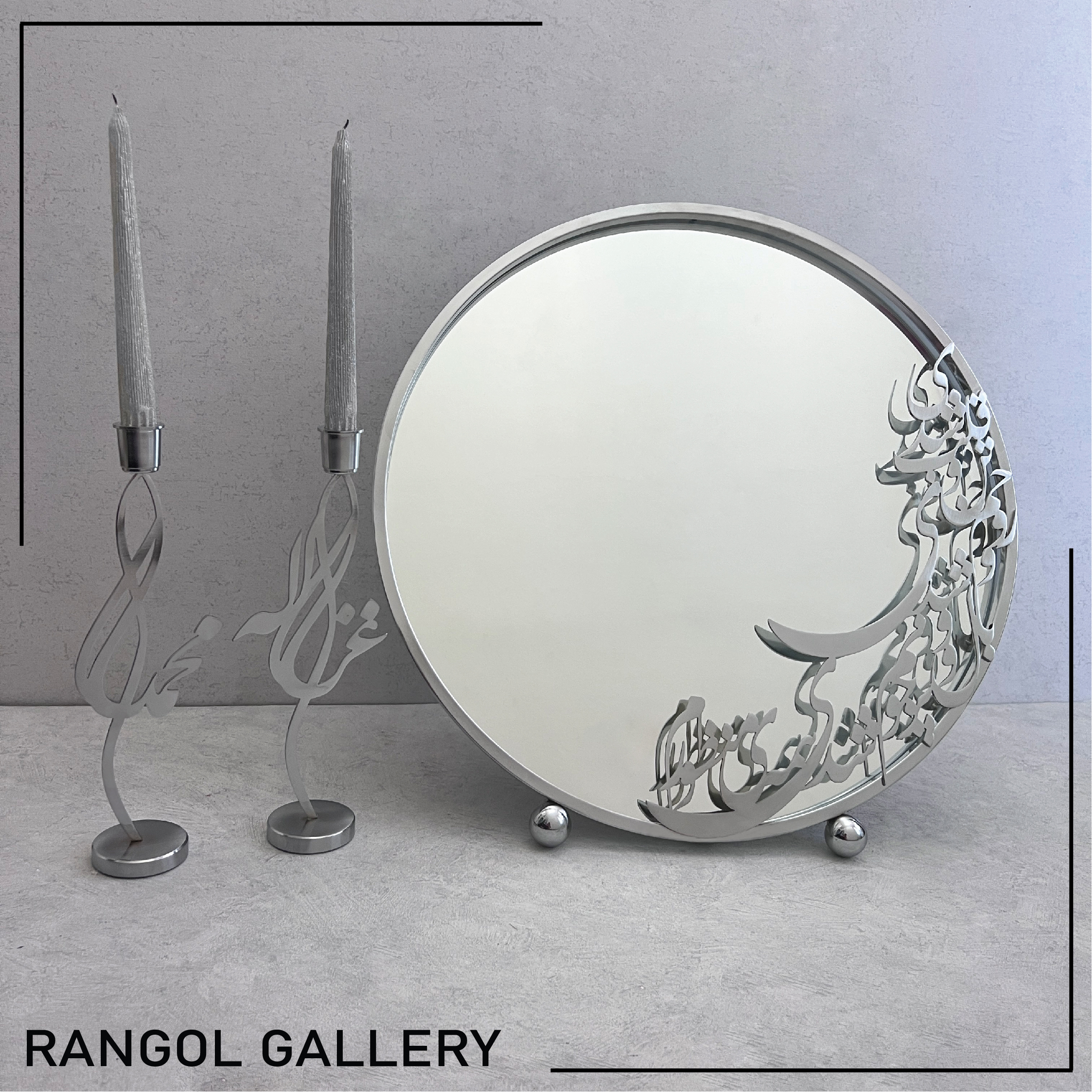 در عکس قطر آینه 50 سانتی متر است و رنگ نقره ای براق استفاده شده است. اسم  شمعدان ها غزاله و محمد است.  با شعر آینه : شدی قلب و تن و روحم شدی بال و پر و جونم شدی همه منظورم .بعد از ثبت سفارش اسم شمعدان ها و شعر آینه قابل تغییر است. آینه و شمعدان جدید به سبک کالیگرافی می باشد.