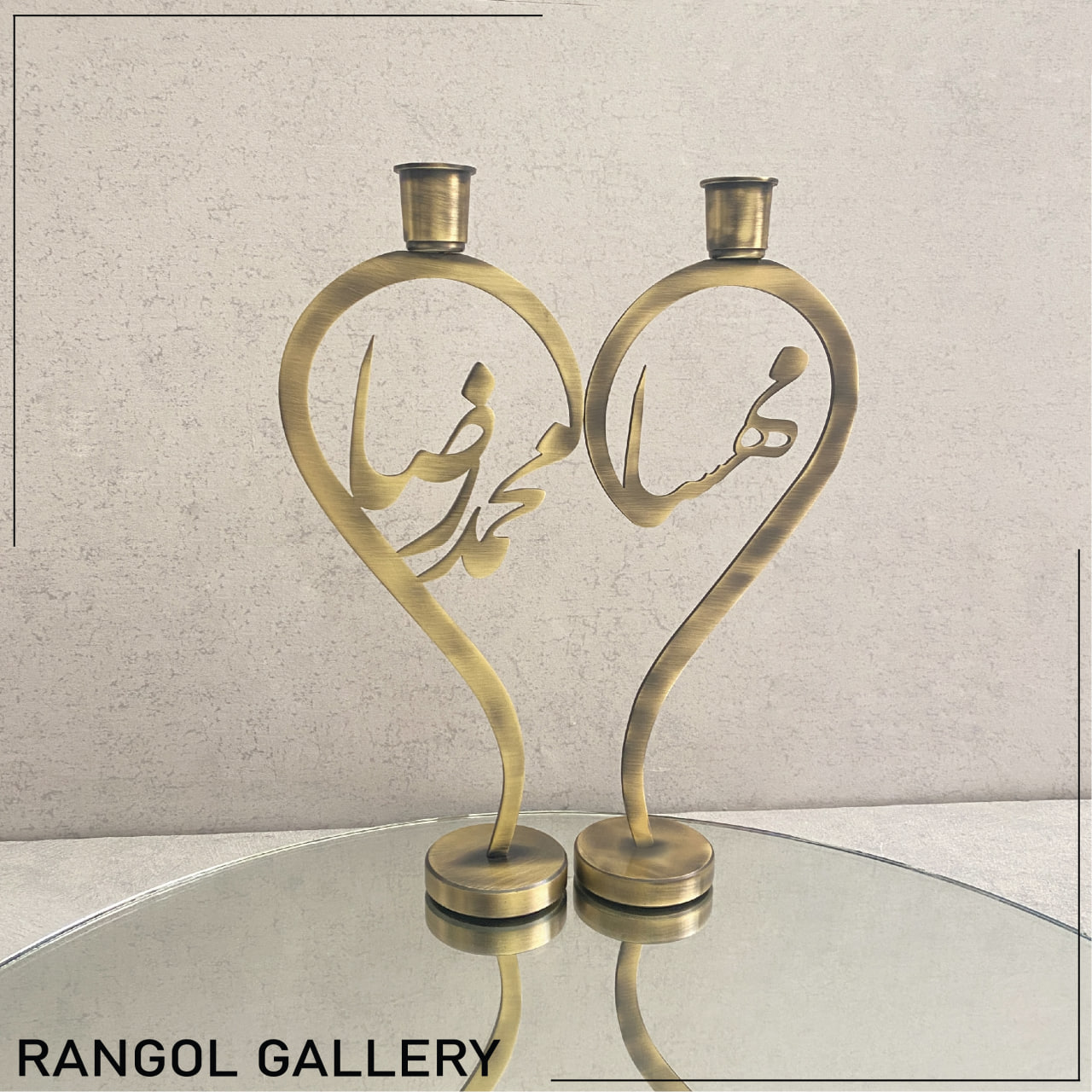 در عکس : شمعدان اسم مهسا و محمدرضا به رنگ آنتیک می باشد