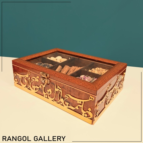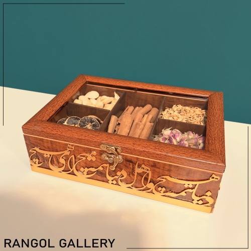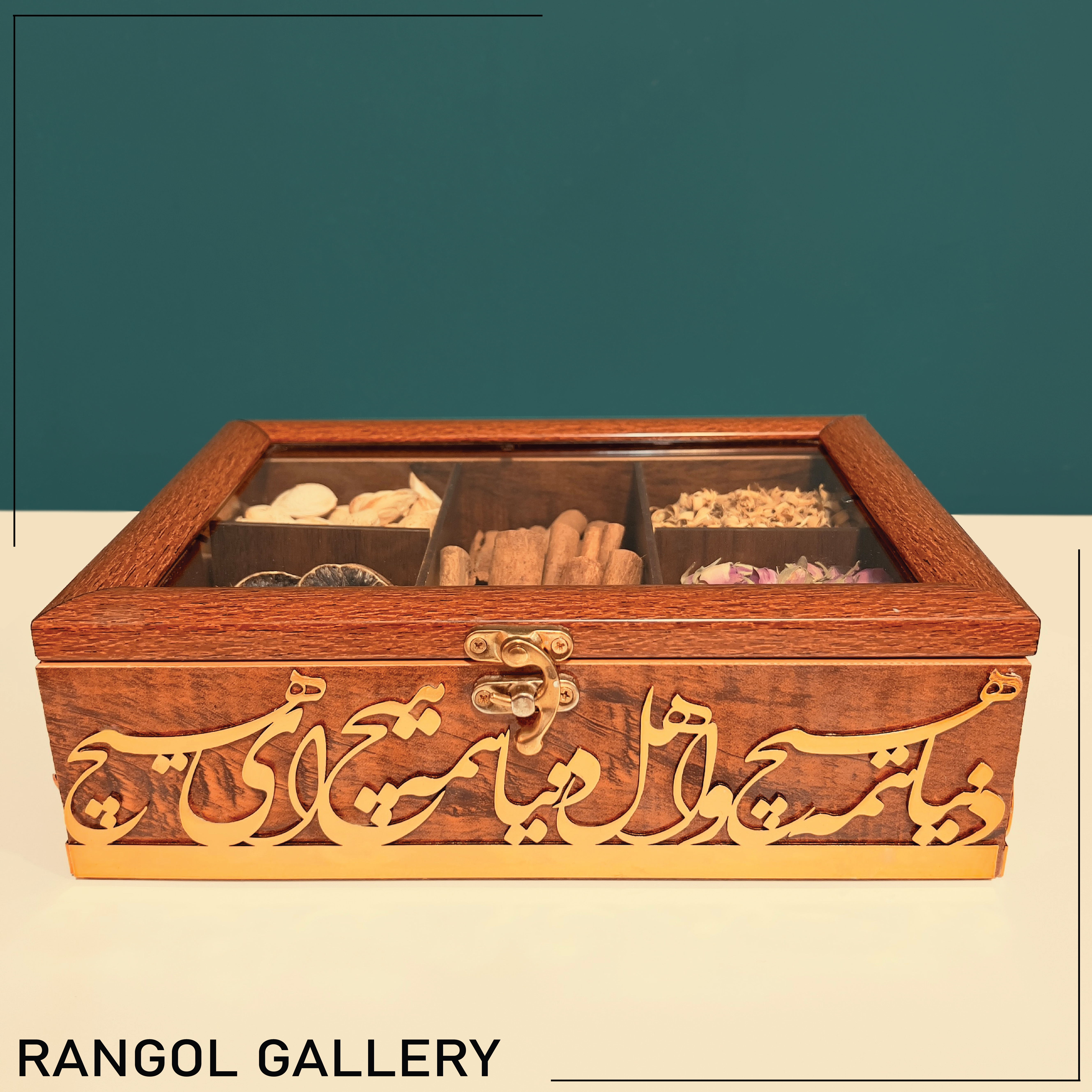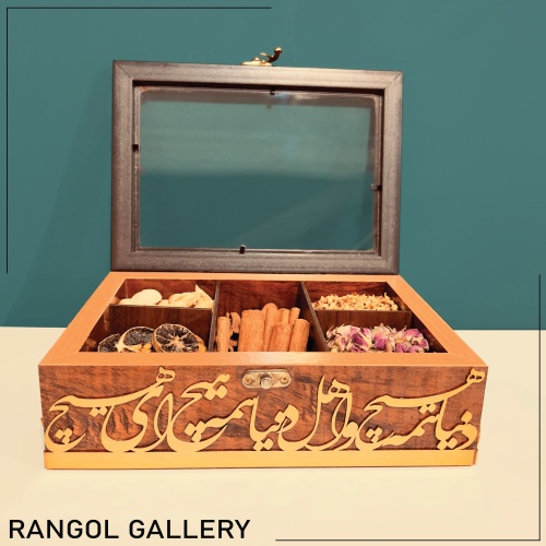 ظرف چوبی تی بگ یا چای کالیگرافی با شعر : دنیا همه هیچ و اهل دنیا همه هیچ ای هیچ برای هیچ بر هیچ مپیچ از مولانا می باشد که روی این ظرف چوبی تیبگ کار شده است