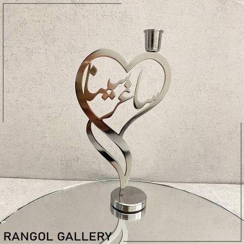 در عکس :شمعدان دو اسمه تک شعله با اسم های ساغر و سینا به رنگ نقره ای براق می باشد