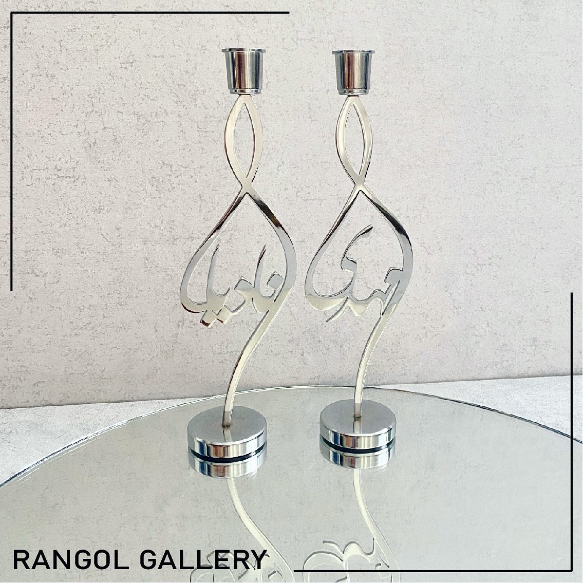 در عکس : شمعدان های اسم مهدی و نادیا به رنگ نقره ای براق می باشد