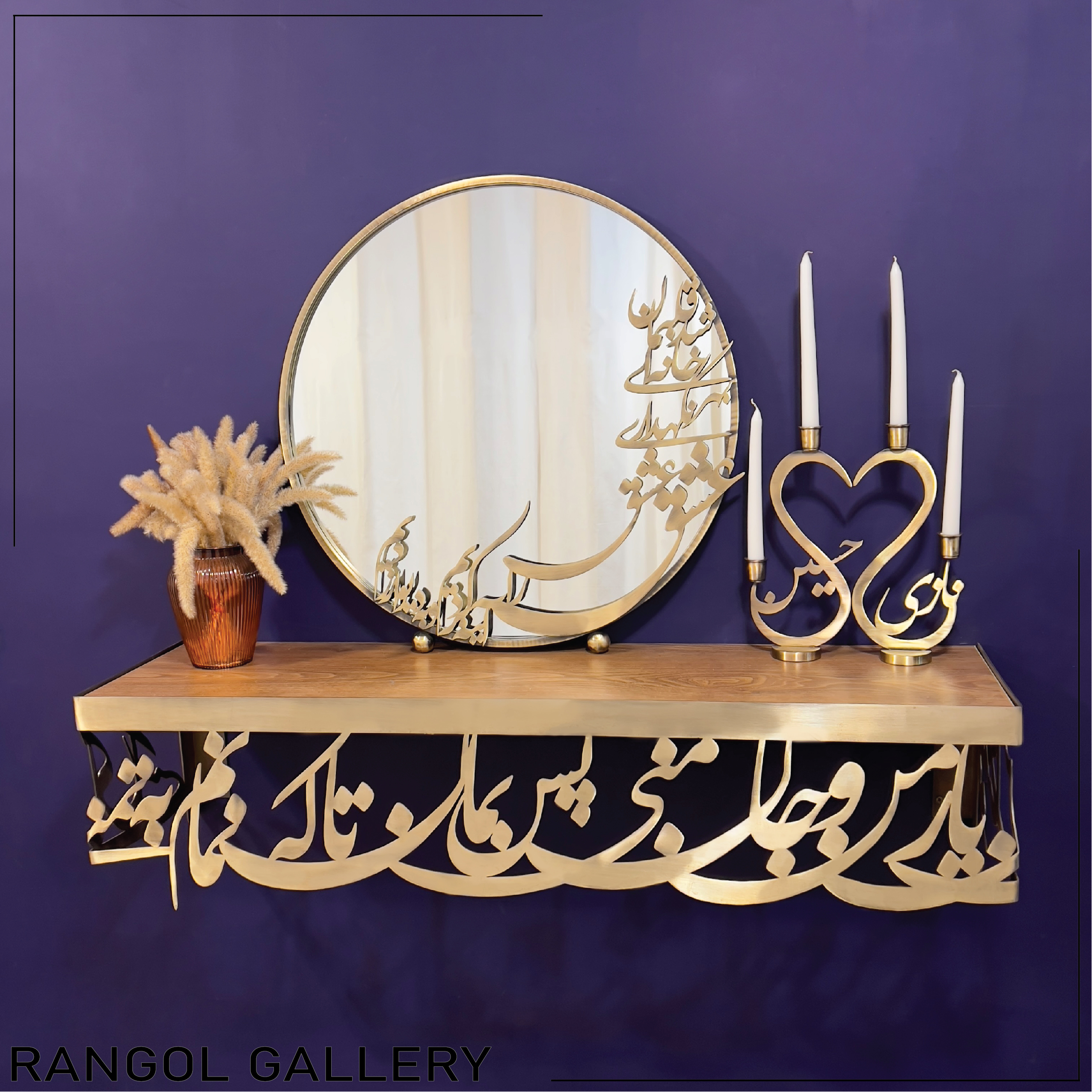 آینه شمعدان دو شعله با شعر : قلبمان شد خانه ای : شهرستان هستم ، بدون آینه داخل کار ارسال شود قطر 60 سانتی متر طلایی
