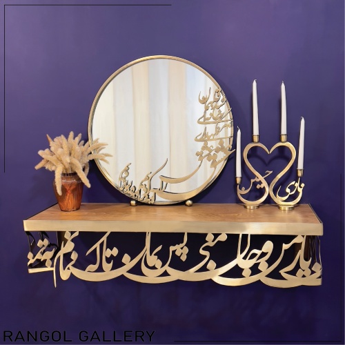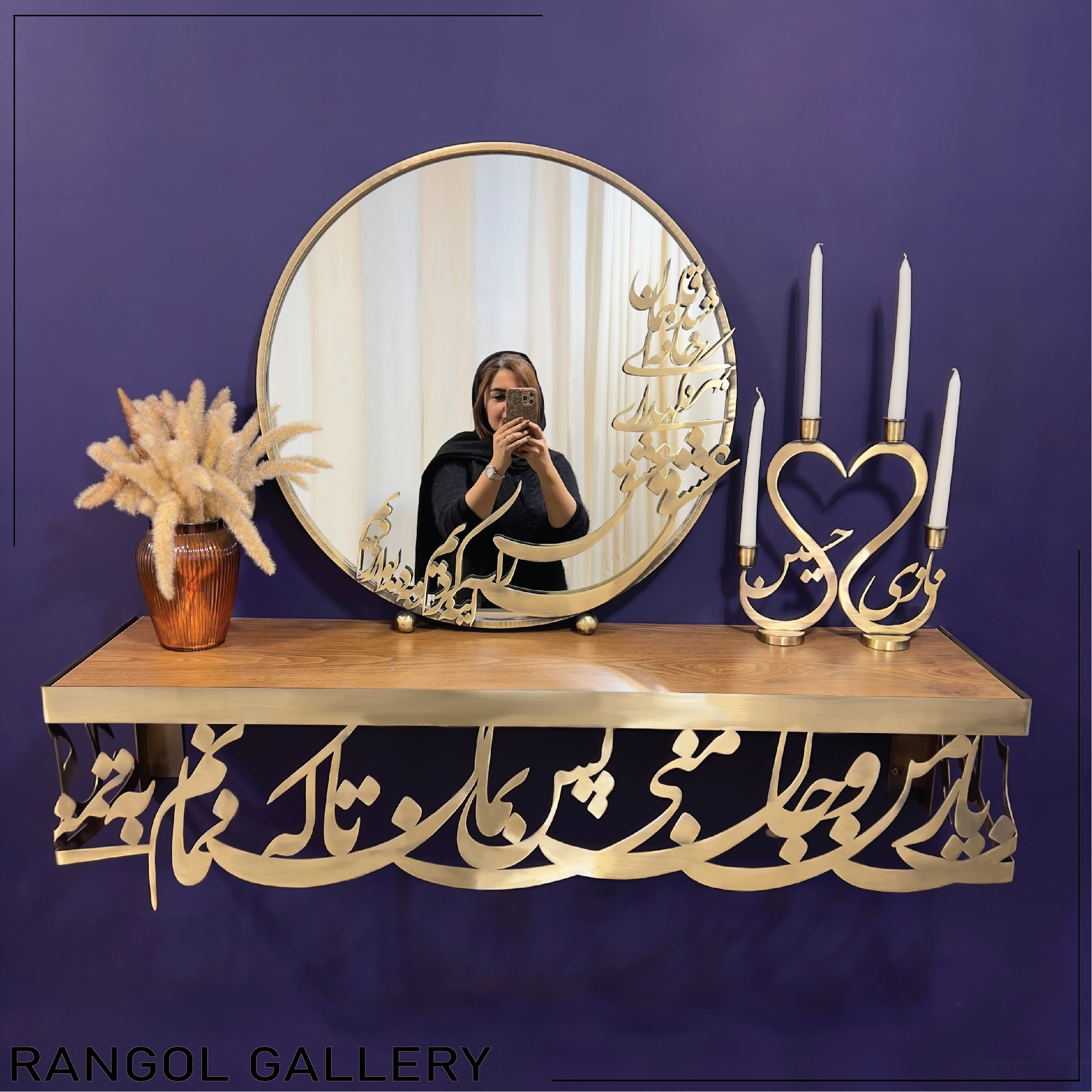 آینه شمعدان دو شعله با شعر : قلبمان شد خانه ای : تهران هستم، با آینه داخل کار ارسال شود قطر 70 سانتی متر طلایی