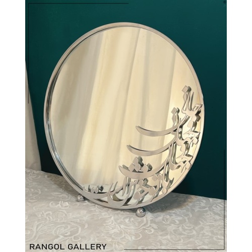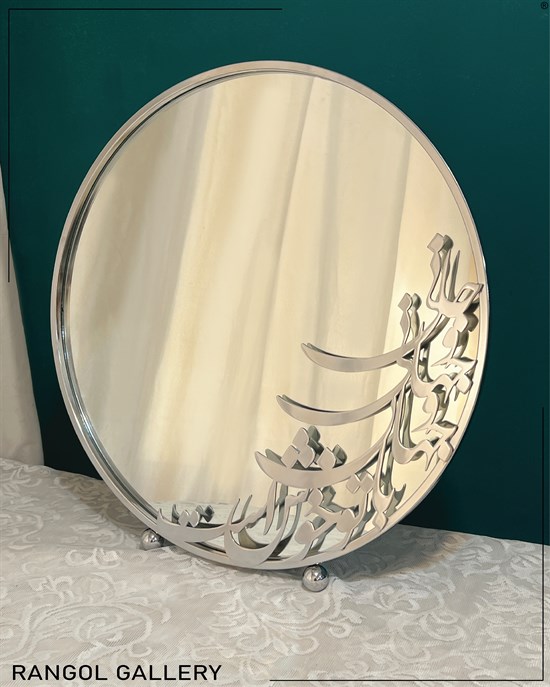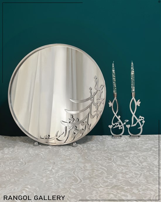 در عکس قطر آینه 60 سانتی متر است و رنگ نقره ای استفاده شده است.شمعدان ها اسم زهرا و حمیدرضا هستند و روی آینه نیز شعر جانی و جهانی و جهان با تو خوش است ، کار شده است .  . بعد از ثبت سفارش اسم شمعدان ها و طرح آن و شعر آینه قابل تغییر است.