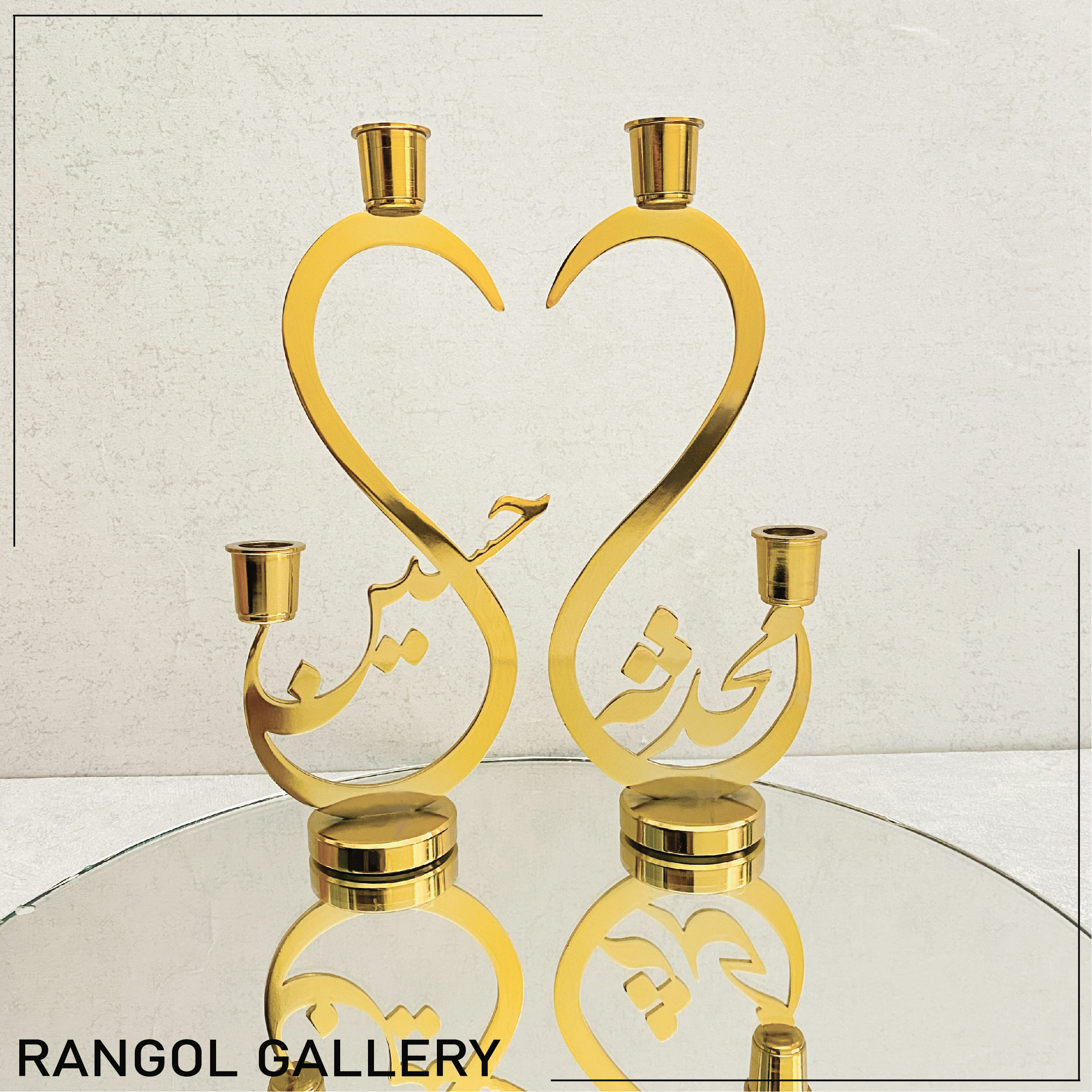 در عکس : شمعدان های اسم محدثه و حسین دو شعله به رنگ طلایی می باشد
