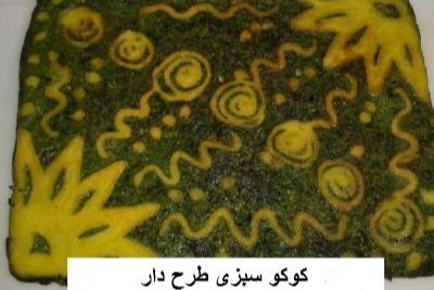 اگر شل و روان  بود کمی آرد نخود چی اضافه کنید. کف تابه رژیمی را با برس چرب کنید (اگر روغن زیاد بریزید طرح شناور میشود ) ومواد کوکو را داخل قیف یکبار مصرف بریزید و طرحت را بکشید  بعد پنج دقیقه روی حرارت متوسط بگزارید تا خودش  را بگیرد و طرحتان فیکس شود .حال که طرح خودش را گرفت میتوانید دوباره روغن به اندازه کافی بریزید بعد مایع کوکو سبزی را کم کم با قاشق رویش بریزید و درش را ببندید تا باحرارت ملایم یک طرفش سرخ شود.  تابه را بچرخانید تا طرف دیگه اش هم سرخ شود.